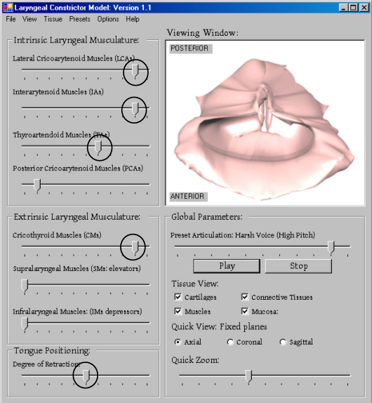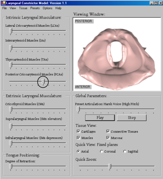 The vocal tract is reinterpreted in the context of the laryngeal articulator model, which integrates the functions of the laryngeal and oral components of the vocal tract. To account for the action of pharyngeal-resonator reduction, for constricted phonation types, and for the interaction of glottal pitch with the laryngeal constrictor mechanism, a three-dimensional model has been developed on the basis of auditory parameters and extrapolation from articulatory data sources. A critical aspect of the proposed model is the functioning of the aryepiglottic sphincter, formed by the aryepiglottic folds at the upper border of the larynx articulating towards the epiglottis. The novel feature of this model is the inclusion of a separate and reversed action of the laryngeal component.